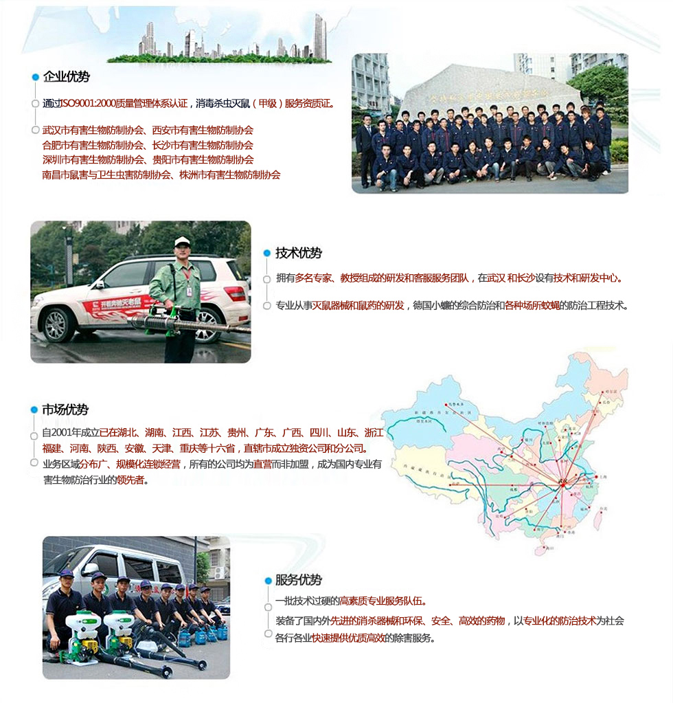 我們堅(jiān)持“誠(chéng)信、高效、安全、環(huán)!钡姆⻊(wù)宗旨,所用器械均為世界優(yōu)質(zhì)產(chǎn)品,所用藥物均系國(guó)家藥檢部門和衛(wèi)生防疫部門批準(zhǔn)的安全、低毒的城市衛(wèi)生用藥,并根據(jù)具體作業(yè)環(huán)境和防治對(duì)象情況變化,制定具體防制方案,保證優(yōu)越的防治效果和人體安全。